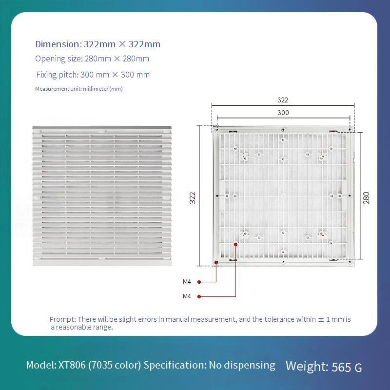 Installasjon krever bare å rengjøre monteringsoverflaten, justere støvdekselet og trykke den på plass. Det anbefales at kvartalsvise inspeksjoner for støvakkumulering blir utført ved hjelp av en støvsuger eller trykkluft for rengjøring. Bytt ut omgående når ventilasjonseffektiviteten synlig synker eller skader oppstår for å opprettholde beskyttelseseffektiviteten.